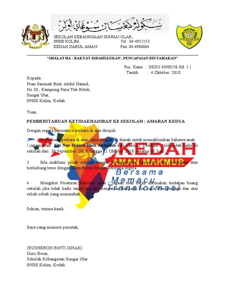Contoh surat amaran dibawah sesuai digunakan bagi menegur pekerja dengan cara yang lebih telus dan berkesan. Cara mengeluarkan surat amaran ponteng sekolah melalui ssdm. Misalnya saja pihak swasta yang ingin mendirikan sekolah harus mendapatkan rekomendasi terlebih dahulu dari pihak terkait. Contoh surat permohonan izin tidak masuk sekolah. Contoh surat lamaran magang lainnya. Amaran kedua saya dengan ini memaklumkan bahawa anak jagaan. Pemberi dan penerima surat pengantar biasanya memiliki penerima yang khusus, sehingga surat pengantar harus menuliskan nama dan penerima pengantar. Surat pernyataan kepala sekolah tentang kesiapan penyelenggaraan pembelajaran tatap muka di sekolah/madrasah menjadi salah satu persyaratan yang harus dipenuhi oleh satuan pendidikan baik sekolah/madrasah untuk dapat menyelenggarakan pembelajaran tatap muka di sekolah. Buang sekolah 14 hari selepas 20 hari lagi selepas amaran terakhir amaran terakhir. Untuk lebih jelasnya, anda bisa melihat contoh surat. Kerja ini nampak remeh, tetapi jika terlalu banyak kerja remeh yang perlu dilakukan, ianya akan membebankan guru. Beserta jawapan balas daripada ibubapa. Sila maklumkan pihak sekolah dengan menggunakan lampiran yang disertakan atau berhubung terus dengan guru besar dengan seberapa segera.