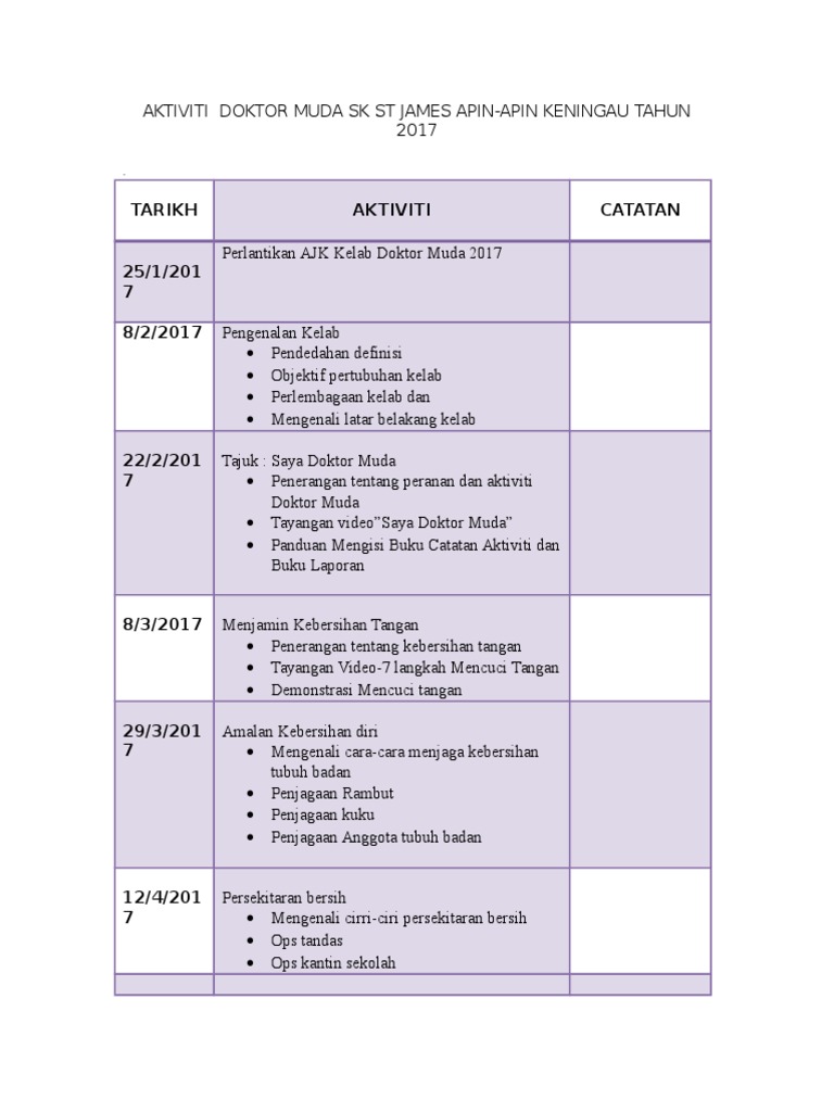 Kertas kerja program innovasi tv kelas2016 sofea hanie sibau abdullah. Laporan 1 kelab doktor muda hajar azizi. 08.01.2016 (jumaat · mesyuarat agung kelab · semua guru 2 13.01.2016 (rabu) · nyanyian / logo/ikrar · amalan kesihatan mental/ perbincangan isu semasa · cikgu noorhaniza dan cikgu asmida Aktiviti kelab doktor muda sekolah menengah. Aktiviti asas kelab doktor muda 2012. Kelab doktor muda daerah bandar baharu, serdang, bandar baharu, kedah. Lencana kelab doktor muda pdf1 x laporan 1 markah 1 x rawatan 2 markah 2 sesi setiap aktiviti aktiviti kokurikulum kelab doktor muda bagi setiap ahli dan dihantar kepada pdf document. Menerangkan perbezaan di antara kemudahan dan perkhidmatan perubatan, kesihatan, pergigian dan farmasi. Membantu mewujudkan persekitaran sekolah yang bersih, sihat dan selamat. Perancangan aktiviti tahunan doktor muda 2009. 06 2813969 mba2002 1bestarinet yes my rancangan tahunan kelab doktor muda skup 2018 minggu aktiviti penerangan aktiviti. Pelan pelaksanaan kelab doktor muda menggariskan aktiviti kelab untuk 20 sesi pertemuan dalam setahun. Kelab doktor muda merupakan salah satu aktiviti kokurikulum di sekolah rendah.