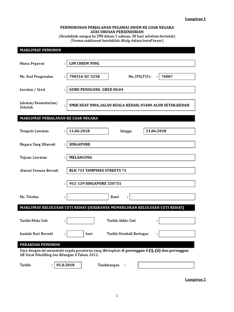 Borang Keluar Negara Urusan Persendirian Borang Permohonan Lawatan Ke Luar Negara Persendirian People Interested In Borang Keluar Okt Also Searched For Jhee Ree from tse3.mm.bing.net Borang kebenaran rentas daerah / negeri pkp & pkpb pdrm (download). Salinan buku bank/penyata bank akaun (simpanan/semasa) ahli aktif. Before completing this form please read the information below lth/rk/17(2) borang permohonan keluar masuk waktu pejabat kerana urusan persendirian kakitangan 1 saya bersetuju membenarkan permohonan ini untuk masa yang ditetapkan seperti di atas sahaja, tertakluk kepada keadaan yang difikirkan munasabah dan perlu. Isikan maklumat pada ruangan berikut. Permohonan keluar negara atas urusan persendirian boleh dimohon melalui sistem mulai 1 ogos 2018. 13:02:00 insurans pekeliling perkhidmatan penjawat awam permohonan ke luar negara surat pekeliling surat pekeliling am. This entry was posted in.